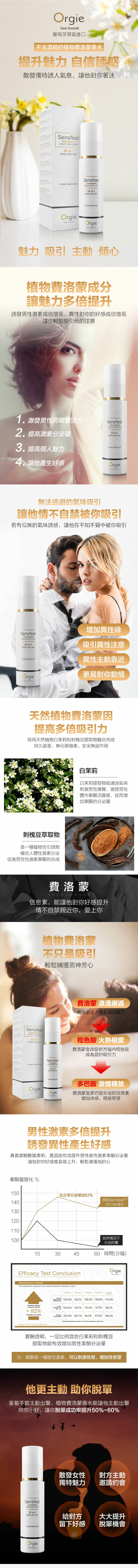 女用10合1費洛蒙噴霧是噴頭設計,乳液的質地,主要為身體及頭髮增添誘人的香氣,又可達到保濕肌膚、柔軟頭髮的效果。 擁有10合1身體及頭髮功能:身體保濕霜、滑嫩肌膚功效、頭髮紫外線過濾器、髮梢修復、防毛躁和解纏結、顏色保護、頭髮光澤和柔軟、發量控制、催情香水、喚醒身體吸引力。 Orgie Sensfeel For Her費洛蒙噴霧是一種天然活性成分,透過白茉莉(Jasminum officinale)及源自角豆(Ceratonia siliqua)的短鏈脂肪酸(SCFA)而增強男性睾酮的產生。加入信息素,無味而不易察覺的物質,可無意中吸引對方。香味在使用後 30 分鐘達到最大效果,並持續數小時。可根據需要重新使用,更突出香氣。